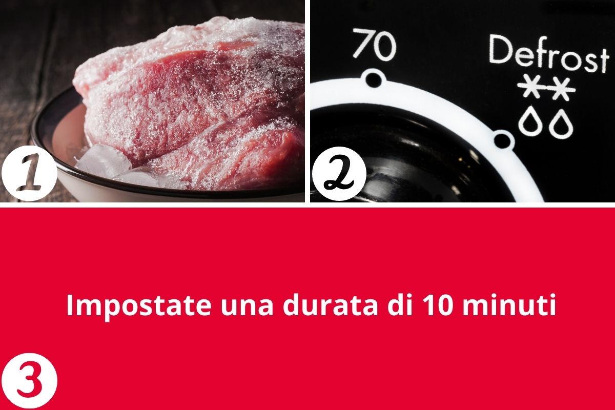 Tenete conto, però, che se il pezzo di carne è molto grosso, all’interno faticherà molto a scongelarsi poiché le microonde penetrano solo fino ad un paio di centimetri negli alimenti: in tal caso è meglio far scongelare e cuocere la carne direttamente nel forno tradizionale!