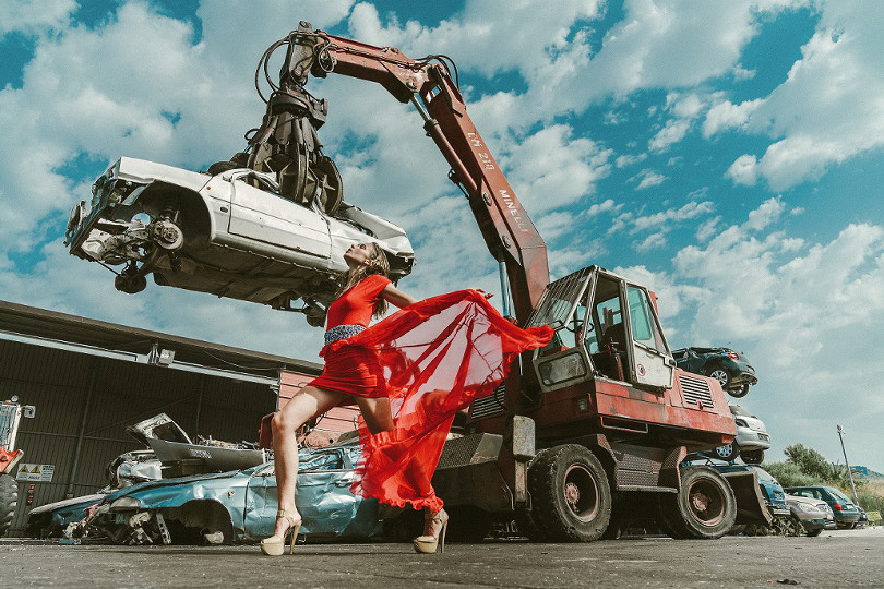 Eles Italia Collezione 2018 ha presentato la sua nuova linea Seductive Emotions con un gioco di forti contrasti fra street e demi couture. La modella, accattivante e intrigante, è fotografata da Riccardo Melosu tra rottami di auto per mettere ancora più in evidenza gli splendidi abiti realizzati da Silvia e Stefania Loriga.