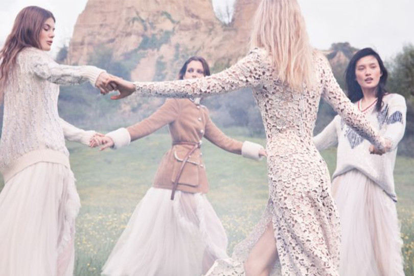 Modelle giovani del terzo millennio che si muovono leggere ed eteree tra campi fioriti, prati sconfinati e montagne. Gli abiti scivolano sul corpo mentre le top si rincorrono tra giochi e girotondi. Eleganza da sogno per gli abiti fluttuanti e per i piccoli dettagli. Immagini magiche e fuori dal tempo. La modella che passeggia con l’elegante cavallo con top in pizzo e gonna in tulle ricorda una magica ninfa dei boschi delle fiabe. Il magico sogno voluto e creato proprio dallo stesso Ermanno Scervino.