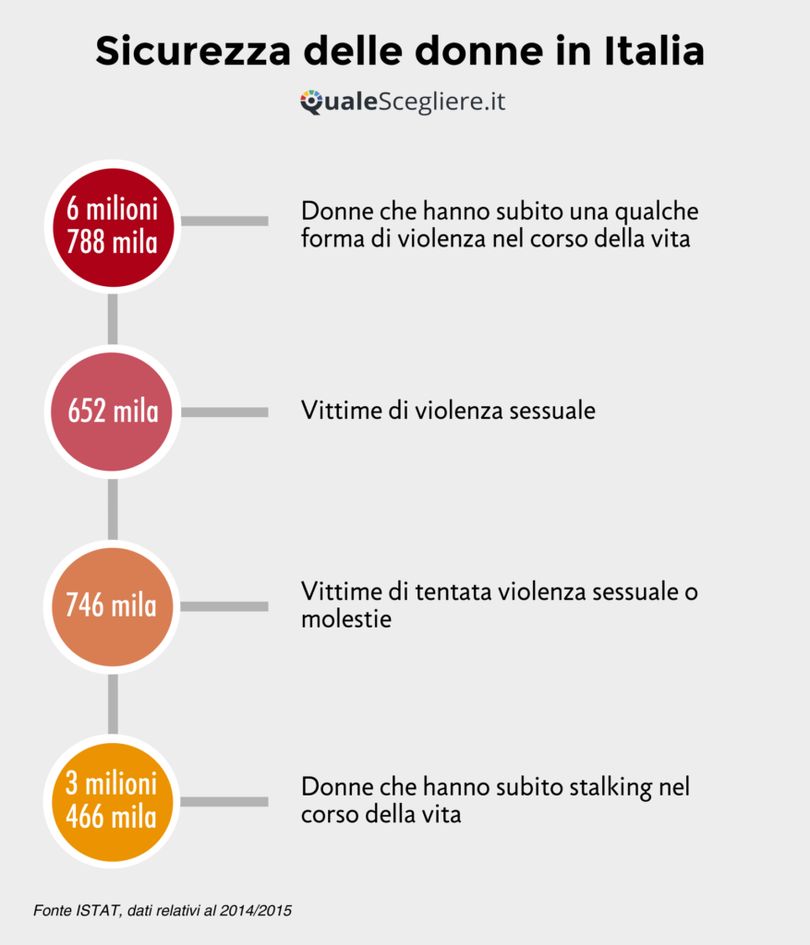 L’obiettivo dello studio realizzato da QualeScegliere.it è quello di aiutare chi è alla ricerca di un senso di maggior sicurezza e tranquillità. Soprattutto in situazioni di preoccupazione, ansia o pericolo, reale o solamente percepito. Questo è un progetto che consiglia e dona informazioni utili alle donne, tutto online. I dati Istat sulla violenza sulle donne sono allarmanti. Su questo tema, insieme alle notizie di cronaca e ai casi di femminicidio, si discute molto.